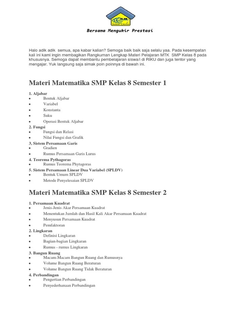 Materi pembelajaran bidang studi matematika smp/mts kelas viii (delapan) semester 1 (gasal) kurikulum 2013 : Soal sudah dilengkapi kunci jawaban dan . 「barisan bilangan dari konsfigurasi objek」. Rangkuman materi ipa kelas 8 semester 2. Rangkuman pelajaran bahasa indonesia kelas 8 merupakan ringkasan materi dari seluruh bab yang ada di bukupaket kelas 8 untuk jenjang smp maupun mts.